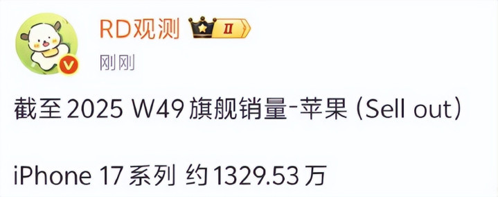 就在12月14日,iPhone17系列的销量再次登上热搜,而且标题就是“iPhone17中国市场卖爆”。根据《新浪新闻》援引RD观测报道的数据,截止2025年第49周,iPhone17系列国内销量达到了1329万部,苹果手机在中国智能手机市场同比增长37%,创下历史新高。